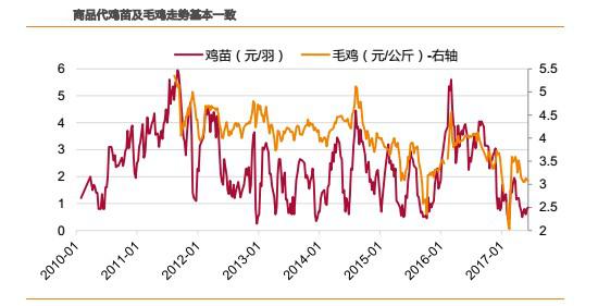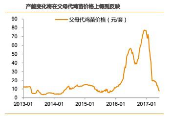 引種規(guī)模的下降意味著祖代存欄的下降,供給的減少將導(dǎo)致父母代雞苗銷售價格下降。由于2012年以前國內(nèi)白羽肉雞需求快速增加,因此,國內(nèi)白羽雞引種規(guī)增速的下降也會引起價格的上漲。例如,2010年的引種規(guī)模與2009年基本持平,僅增長3萬套。受此影響,父母代雞苗價格也從2010年9月份開始反彈。同樣的,隨著2014年引種規(guī)模的下降,父母代雞苗價格則從2014年3月見底回升,中間雖有波動,但從2015年10月即開始一輪快速上漲。也就是說,對于祖代產(chǎn)能的變化,父母代雞苗價格是一個重要的驗證指標。