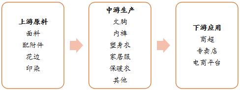 萊卡內(nèi)衣上游原料主要有面料、附配件、花邊、丈根、印染,內(nèi)衣生產(chǎn)廠將這些原料經(jīng)過研發(fā)設(shè)計(jì),生產(chǎn)出相應(yīng)的內(nèi)衣產(chǎn)品:文胸、內(nèi)褲、塑身衣、家居服、保暖衣等。下游終端零售為:商超、專賣店、店商平臺(tái)。