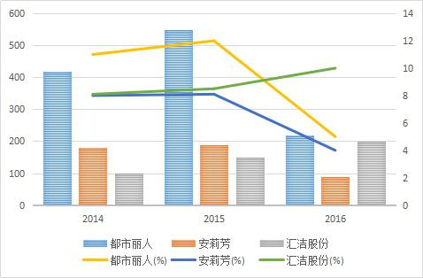 匯潔股份的增長增速是在放緩的。公司2015年?duì)I收和凈利分別同比增長了14.13%和24.63%,2016年這兩個(gè)數(shù)據(jù)則只有8.54%和10.77%。所以,零售環(huán)境的疲弱確實(shí)不可否認(rèn)。