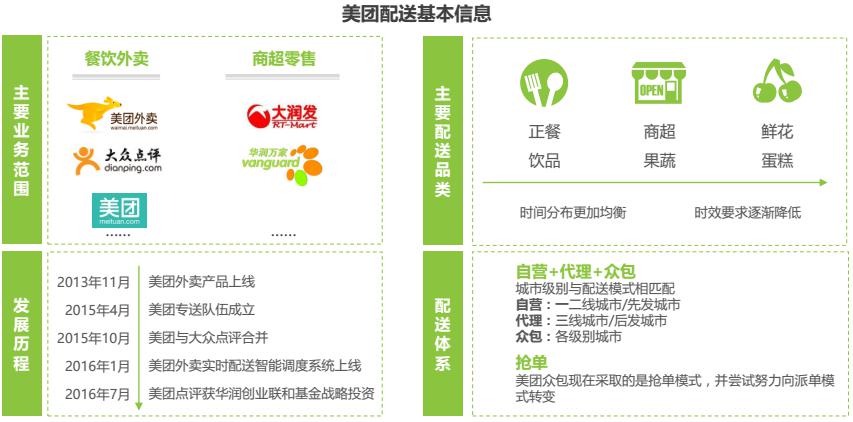 2017年初,美團(tuán)外賣(mài)配送日訂單量已經(jīng)超過(guò)900萬(wàn)單,美團(tuán)配送團(tuán)隊(duì)完成的訂單比例逐步提升,配送能力日漸增強(qiáng)?;诿缊F(tuán)外賣(mài)入駐商家類(lèi)型的多元化,美團(tuán)配送的品類(lèi)也在不斷擴(kuò)展。為快速開(kāi)拓三四線城市的市場(chǎng),美團(tuán)外賣(mài)采用“自建+加盟代理+眾包”的運(yùn)力組織形式,適應(yīng)不同市場(chǎng)的需要。