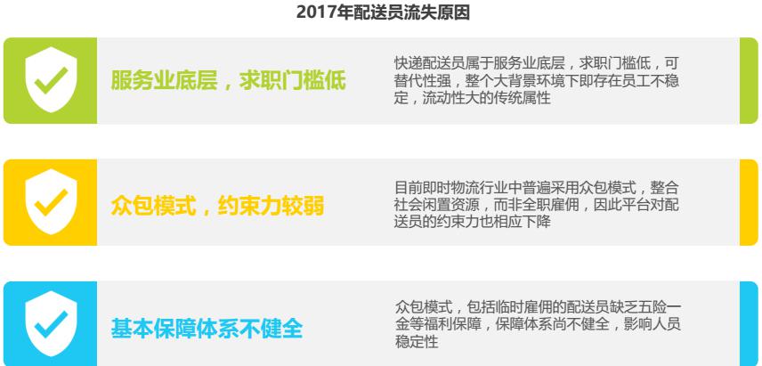 維持穩(wěn)定的配送員團(tuán)隊(duì),對(duì)于配送平臺(tái)的發(fā)展至關(guān)重要。但目前即時(shí)物流行業(yè)存在配送人員流失率高的難題。究其原因,存在以下三方面的因素:求職門(mén)檻低、可替代性強(qiáng),平臺(tái)對(duì)人員的約束力較弱以及基本保障體系不健全。