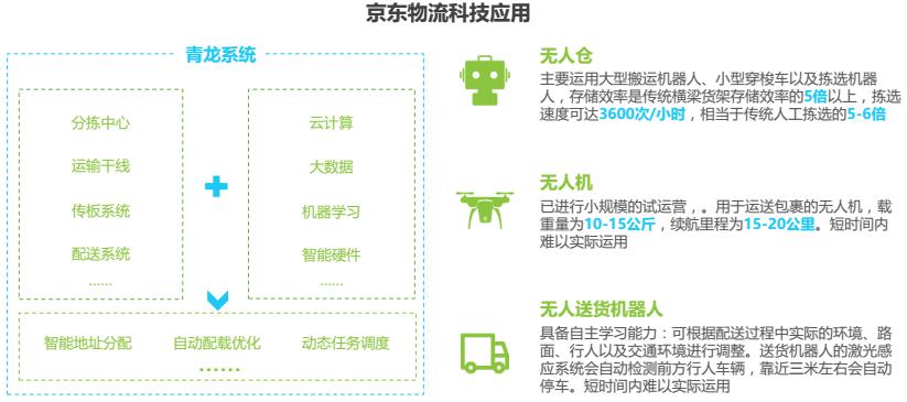 京東于2016年成立了X事業(yè)部,專(zhuān)注智慧物流相關(guān)技術(shù)的研發(fā)。2017年4月京東物流宣布獨(dú)立運(yùn)營(yíng),成立物流子公司。截止2017年6月,京東在全國(guó)范圍內(nèi)擁有256個(gè)大型倉(cāng)庫(kù),6906個(gè)配送站和自提點(diǎn),包括已經(jīng)運(yùn)營(yíng)了7個(gè)大型智能化物流中心“亞洲一號(hào)”。目前京東自營(yíng)配送覆蓋了全國(guó)98%的人口,壓縮商品流通成本70%,提升物流運(yùn)營(yíng)效率2倍以上。京東物流科技的應(yīng)用主要包括兩個(gè)方面,一是基于大數(shù)據(jù)預(yù)測(cè)分析技術(shù)實(shí)現(xiàn)智能化的調(diào)度、決策;二是采用一些更自動(dòng)化、智能化的設(shè)備提升物流效率,最終提升客戶(hù)的體驗(yàn)。