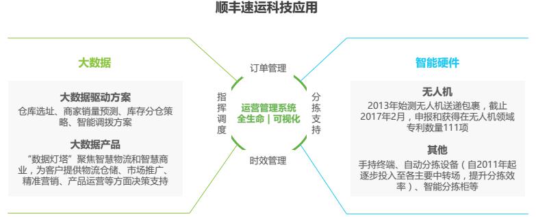 順豐速運(yùn)成立于1993年,截止2016年12月,順豐控股業(yè)務(wù)覆蓋全國(guó)331個(gè)地級(jí)市、2620個(gè)縣區(qū)級(jí)城市,近13000個(gè)自營(yíng)網(wǎng)點(diǎn)。順豐速運(yùn)業(yè)務(wù)包括國(guó)際業(yè)務(wù)、同城配送、冷運(yùn)、重貨(陸路&航運(yùn))等。順豐一貫重視在信息化領(lǐng)域的投入,負(fù)責(zé)集團(tuán)信息系統(tǒng)研發(fā)與運(yùn)維的科技人員超過(guò)2,000名,16年信息技術(shù)費(fèi)投入2.6億、占營(yíng)業(yè)成本0.57%,相較15年提升0.08個(gè)百分點(diǎn)。14-16年來(lái),順豐控股申報(bào)和獲得的專(zhuān)利523項(xiàng),軟件著作權(quán)200多項(xiàng)。未來(lái),順豐還將繼續(xù)擴(kuò)大在科技領(lǐng)域投入,不斷提高各方面的科技與智能化水平。