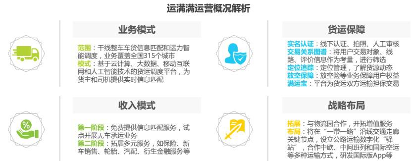 運(yùn)滿(mǎn)滿(mǎn)成立于2013年,是基于云計(jì)算、大數(shù)據(jù)、移動(dòng)互聯(lián)網(wǎng)和人工智能技術(shù)開(kāi)發(fā)的貨運(yùn)調(diào)度平臺(tái),為貨主和司機(jī)提供實(shí)時(shí)信息匹配,減少貨運(yùn)空載率、提高物流運(yùn)行效率。由于模式相近,運(yùn)滿(mǎn)滿(mǎn)被業(yè)界稱(chēng)為“貨運(yùn)版的滴滴”,成立3年來(lái)共獲得7輪融資,目前估值超過(guò)10億美金。截止2017年9月底,平臺(tái)實(shí)名注冊(cè)重卡司機(jī)400余萬(wàn)、貨主100余萬(wàn),業(yè)務(wù)覆蓋全國(guó) 315 個(gè)城市。運(yùn)滿(mǎn)滿(mǎn)最新推出擔(dān)保交易產(chǎn)品“滿(mǎn)運(yùn)寶”,為貨運(yùn)雙方提供運(yùn)費(fèi)擔(dān)保。此外,運(yùn)滿(mǎn)滿(mǎn)還與阿里云、菜鳥(niǎo)、螞蟻金服、平安保險(xiǎn)、中國(guó)聯(lián)通、中國(guó)重汽等開(kāi)展深度戰(zhàn)略合作,通過(guò)跨界融合,不斷推出創(chuàng)新產(chǎn)品和服務(wù)。未來(lái),運(yùn)滿(mǎn)滿(mǎn)將借助人工智能、無(wú)人駕駛、區(qū)塊鏈等技術(shù)驅(qū)動(dòng),提供貫穿全產(chǎn)業(yè)鏈的線上線下服務(wù),構(gòu)建公路物流生態(tài)圈,打造綜合性的貨運(yùn)平臺(tái)。