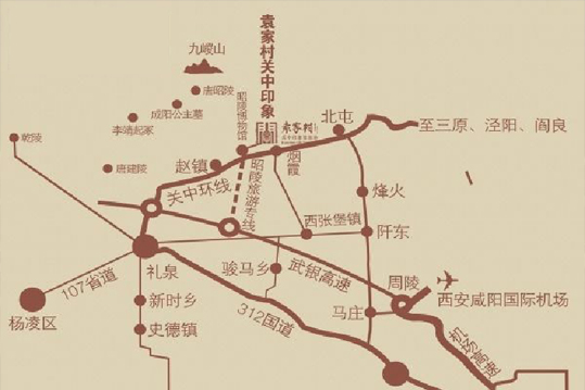 袁家村位于咸陽市禮泉縣,距離咸陽國際機場較近,空運便利,有利于吸引國際旅客前來觀光體驗。附近機場高速、武銀高速、312國道、107省道、關(guān)中環(huán)線等道路密布,交通發(fā)達,西安至禮泉、西安至袁家村、咸陽至袁家村的客運大巴發(fā)車頻率高,游客無論是乘大 巴還是自駕游都很便利。